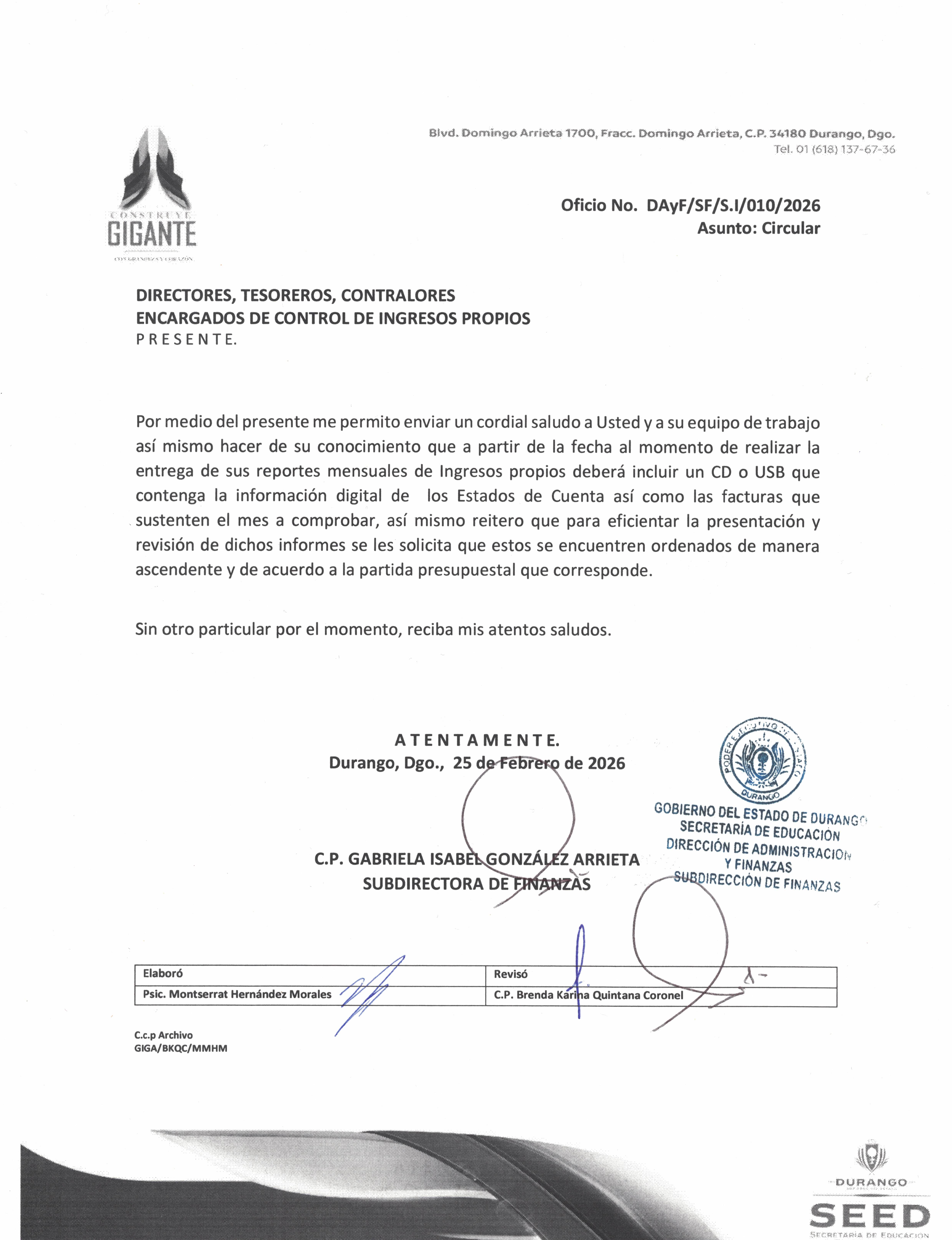 Nueva capacitación en línea de Ingresos Propios vía Youtube * Todos los oficios de incorporación, modificación de datos de los planteles y demás oficios dirigidos al Director de Administración y Finanzas deberán ser entregados en la oficina de Ingresos Propios. (Región Durango) El horario de recepción de informes es de lun a vie de 8am a 2pm, según Cronograma para presentación de Informes.